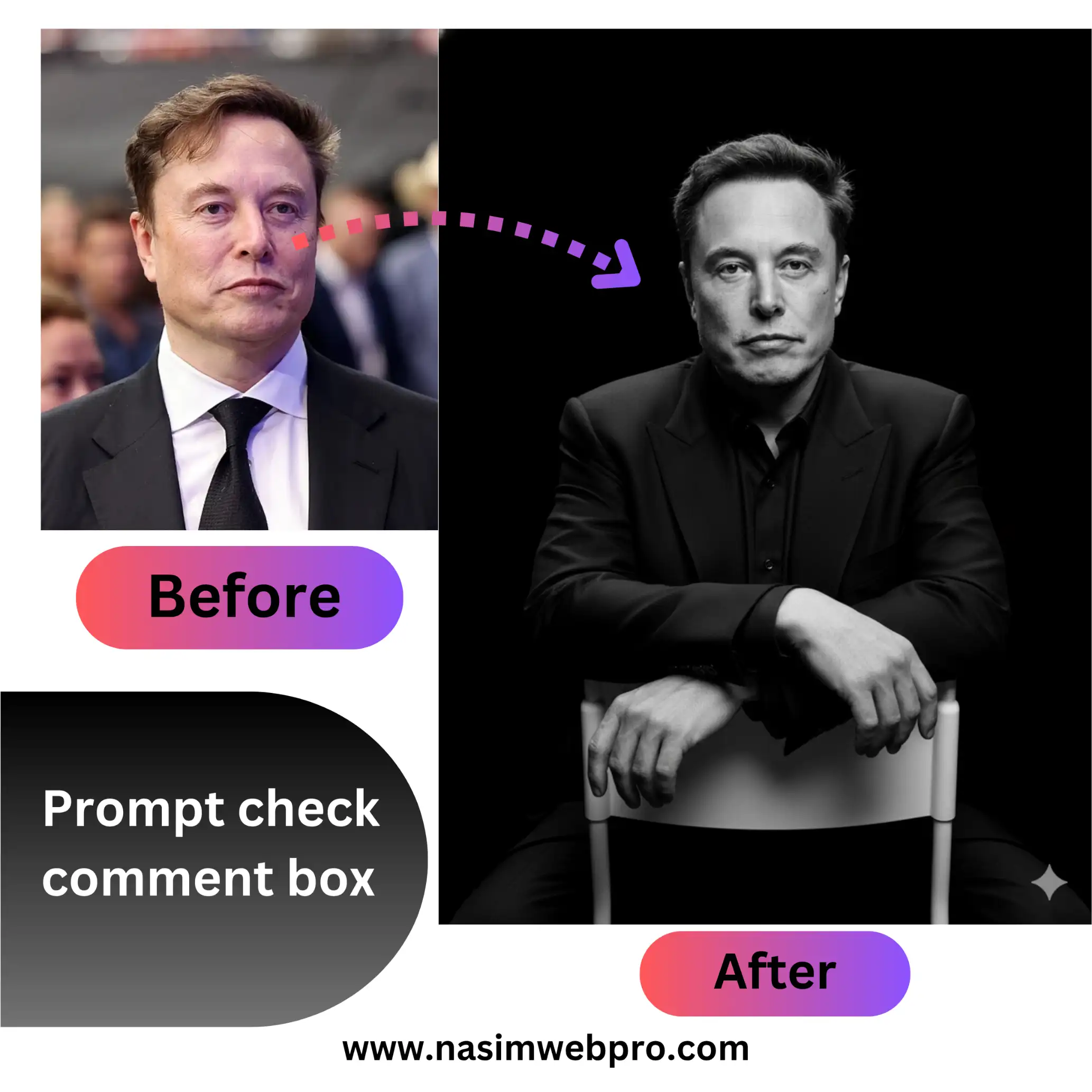 [Here you would ideally place the before and after images of Elon Musk that were generated earlier, or a similar example if available to you for your website.]